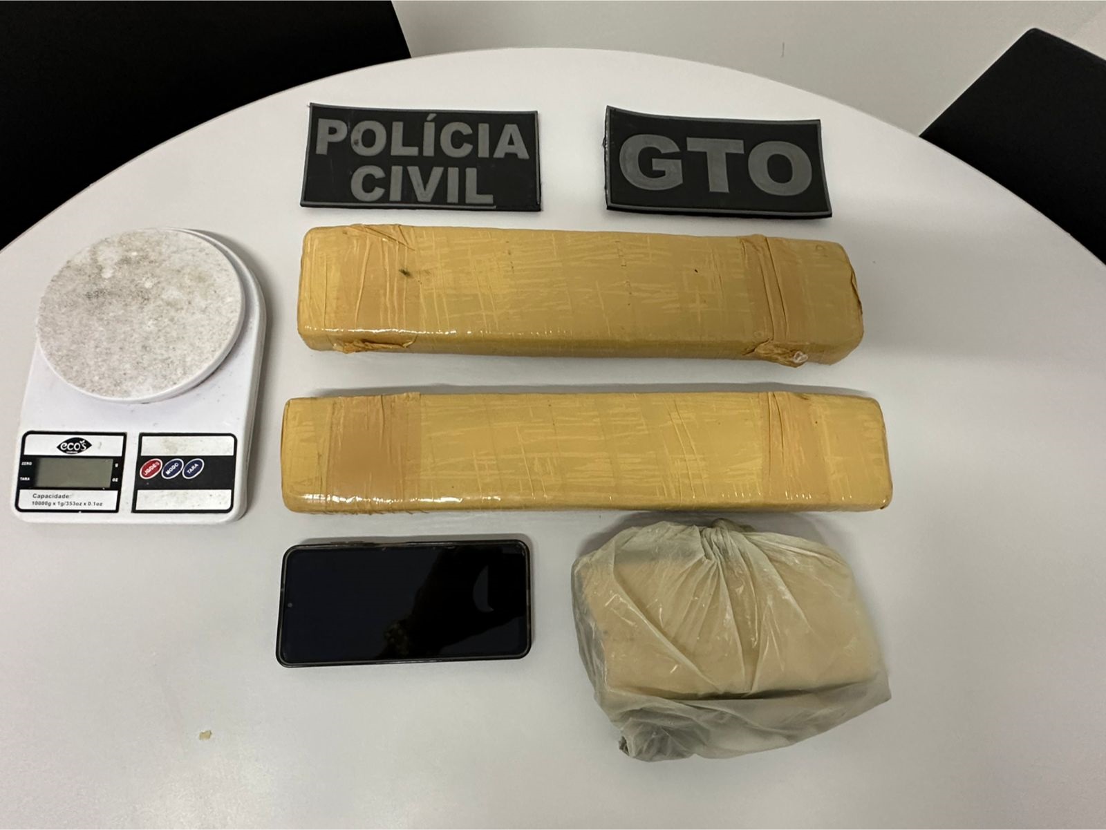 Durante a abordagem, foi apreendida uma caixa localizada na parte superior do imóvel, contendo dois tabletes e uma porção de maconha, além de uma balança de precisão. O material foi apreendido e o suspeito confirmou ser o proprietário da droga.